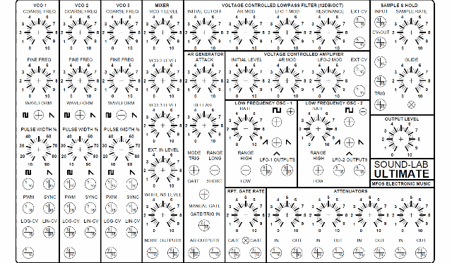 So it's got 3 VCOs, 1 VCF, 1 AR generator, 1 VCA, 2 LFOs, a mixer with white noise and external in, and Sample & Hold.
